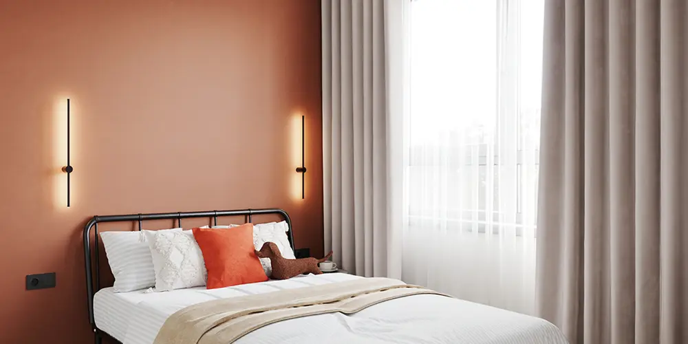- Стены: акцентная стена в приглушённом терракотовом оттенке за изголовьем кровати.